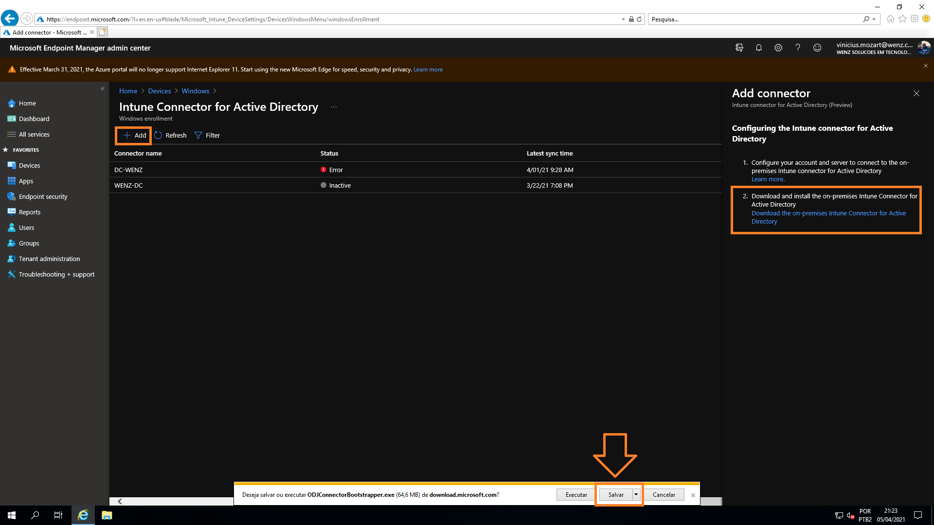 Efetue o download o instalador do "Intune Connector" em seu servidor de Active Directory local.